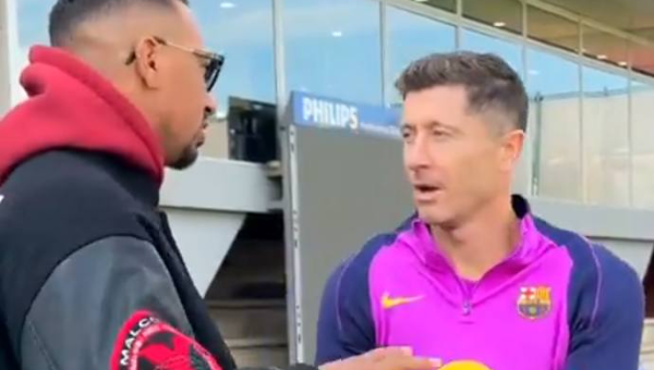 เยโรม บัวเต็ง พูดคุยกับเพื่อนเก่าอย่าง โรเบิร์ต เลวานดอฟสกี้ ระหว่างเดินทางมาปรากฎตัวที่สนามฝึกซ้อมของ บาร์เซโลน่า