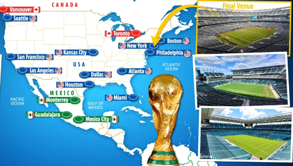 อเมริกาเหนือเป็นพื้นที่ขนาดใหญ่ และฟุตบอลโลกจะจัดขึ้นใน 16 เมือง ครอบคลุม 4 เขตเวลา และ 3 ประเทศ ในสถานที่ซึ่งห่างกันมากถึง 2,800 ไมล์