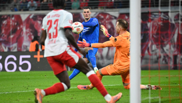 ครึ่งหลังนาที 53 ไลป์ซิก มีลุ้นตีเสมอ คอนราด ฮาร์เดอร์ มีโอกาสได้จิ้มบอลจ่อๆ ในเขตโทษ ทว่าติดเซฟของ มาร์ค เฟล็คเค่น หวุดหวิด