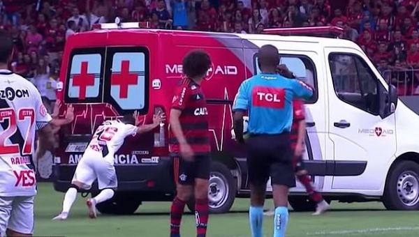 นักเตะวาสโก ดา กาม่า และ ฟลาเมงโก้ แสดงความเป็นน้ำหนึ่งใจเดียว ช่วยกันเข็นรถพยาบาลที่เกิดสตาร์ตไม่ติดระหว่างลงมารับนักเตะในสนาม