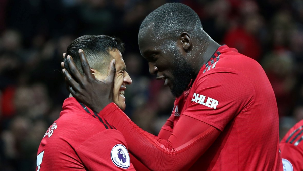 โรเมลู ลูกากู แสดงความยินดีไปยัง อเล็กซิส ซานเชซ กองหน้าเพื่อนร่วมทีมแมนเชสเตอร์ ยูไนเต็ด ที่เพิ่งโขกประตูชัยให้ทีมคว้า 3 คะแนน
