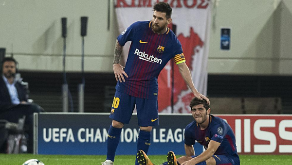 ลิโอเนล เมสซี่ กัปตันทีมบาร์เซโลน่าปลอบประโลมรุ่นน้อง เซร์จี้ โรเบร์โต้ ซึ่งบาดเจ็บในช่วงท้ายครึ่งแรกในเกมเยือนโอลิมเปียกอสเมื่อคืนวันอังคารที่ผ่านมา