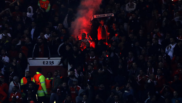 เหยี่ยวลิสบอน เพิ่งยกพลบุกไปเยือน แมนเชสเตอร์ ยูไนเต็ด ในเกม ยูฟ่า แชมเปี้ยนส์ ลีก เมื่อวันอังคารที่ผ่านมา และมีภาพของแฟนบอลทีมเยือนจุดพลุไฟในสนาม