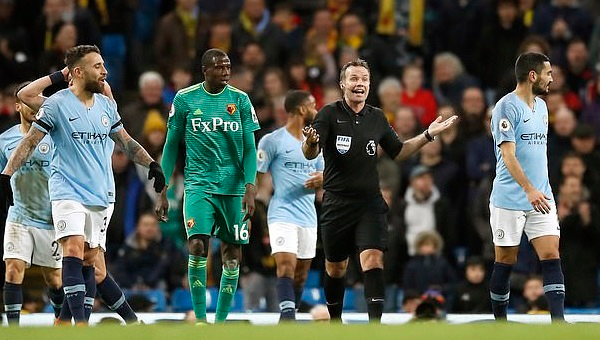 ประตูแรกในช่วงต้นครึ่งหลัง มาจากจังหวะที่ สเตอร์ลิง ยืนอยู่ในตำแหน่งล้ำหน้าชัดเจน ขณะวิ่งเข้าหาบอลที่ เซร์คิโอ อเกวโร่ สะกิดต่อมาให้ แต่เป็น ดารีล ยานมัต กองหลัง วัตฟอร์ด เตะสกัดไปโดนตัว สเตอร์ลิง เข้าประตูไป แม้ผู้ช่วยผู้ตัดสิน เอเดรียน โฮล์มส์ ยกธงล้ำหน้า แต่หลังจาก พอล เทียร์นี่ย์ ผู้ตัดสินวิ่งไปคุยด้วย และใช้เวลาตัดสินใจอยู่นาน จึงตัดสินใจเป่าให้เป็นประตู
