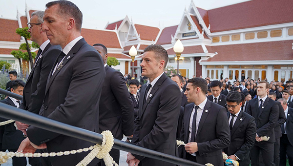 จอน รัดกิ้น ผู้อำนวยการสโมสร และ เบรนแดน ร็อดเจอร์ส ผู้จัดการทีม เลสเตอร์ ซิตี้ นำทัพนักเตะและสต๊าฟฟ์ร่วมพิธีพระราชทานเพลิงศพอดีตประธานสโมสร วิชัย ศรีวัฒนประภา