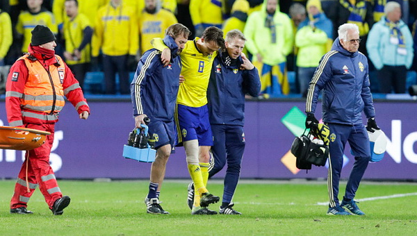 "ดาวเตะสวีเดนได้รับการวินิจฉัยว่ามีรอยแผล และรอยฟกช้ำที่หัวเข่าข้างขวา ในขณะที่แข้งอังกฤษนั้นมีอาการฟกช้ำที่หัวเข่าขวาเช่นเดียวกัน"