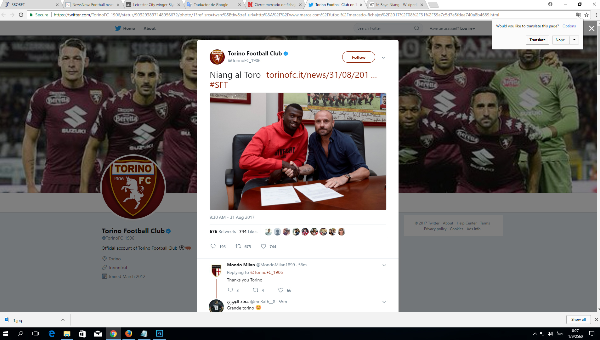 เอ็มบาย เนียง กองหน้าชาวเซเนกัลของ มิลาน ย้ายไปค้าแข้งกับ โตริโน่ ด้วยสัญญายืมตัว 1 ปีพร้อมอ็อปชั่นซื้อตัวร่วมทีมถาวรมูลค่า 15 ล้านยูโร