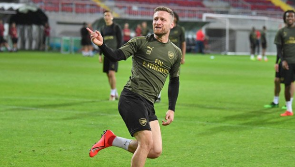 ชโคดราน มุสตาฟี่ กองหลังของ อาร์เซน่อล โชว์วอลเล่ย์ประตูตุงตาข่ายสุดสวยในระหว่างการซ้อมก่อนทำศึกยูโรปา ลีกรอบชิงชนะเลิศ