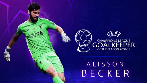 อาลีสซง เบ็คเกอร์ นายทวารตัวเก่งของลิเวอร์พูล คว้ารางวัลผู้รักษาประตูยอดเยี่ยมของศึกยูฟ่า แชมเปี้ยนส์ ลีก เมื่อฤดูกาลที่แล้วไปครองตามคาด