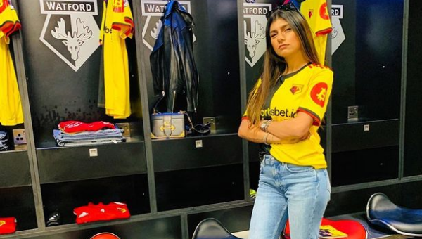 มีอา คาลิฟา พอร์นสตาร์คนดัง โพสต์ภาพผ่านอินสตราแกรมส่วนตัวในเสื้อของ วัตฟอร์ด เชียร์ทีมในเกมที่เสมอกับ อาร์เซน่อล 2-2 ศึกพรีเมียร์ลีก เมื่อคืนวันอาทิตย์ที่ผ่านมา