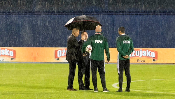 เกมฟุตบอลโลกรอบคัดเลือกโซน ยุโรป ระหว่าง โครเอเชีย พบกับ โคโซโว เมื่อวันเสาร์ที่ผ่านมา ต้องมีอันยกเลิกกลางคันเนื่องจากฝนที่ตกลงมาอย่างหนักทำให้สนามไม่พร้อมใช้งานต่อไปได้