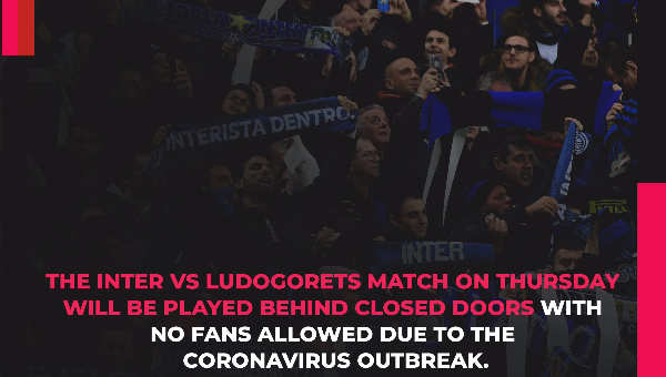 อินเตอร์ มิลาน ต้องลงเล่นในยูโรปา ลีก รอบ 32 ทีมสุดท้าย นัดสองกับ ลูโดโกเร็ตส์ แบบไม่มีคนดูเพื่อเลี่ยงไวรัสโคโรน่าจากการยืนยันของ ยูฟ่า