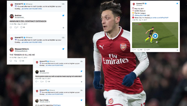 แฟนบอล ’ปืนใหญ่’ อาร์เซนอล แห่กันออกมาตอบทวิตเตอร์ในโพสทางการของสโมสรขณะลงคลิปการเล่นของ เมซุต โอซิล เพลย์เมกเกอร์ตัวเก่งของทีม หวังว่าจะเป็นข่าวที่ทืมสามารถต่อสัญญากับดาวเตะรายนี้ออกไปได้