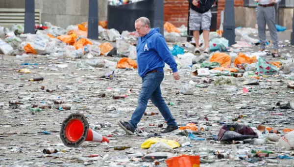 ใจกลางเมืองลีดส์เต็มไปด้วยขยะเกลื่อนพื้น หลังแฟนบอลฉลองแชมป์และเลื่อนชั้นกลับสู่พรีเมียร์ลีก ลุกลามกลายเป็นความรุนแรงจนมีเจ้าหน้าที่หญิงบาดเจ็บหนัก