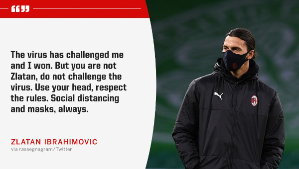 ในฐานะคนที่เคยผ่านการติดเชื้อมาก่อน "อิบรา" จึงขอแนะนำคนอื่นในสไตล์ตัวเองว่า "ไวรัสท้าทายผมและผมเป็นผู้ชนะ แต่ถ้าคุณไม่ใช่ ซลาตัน ดังนั้นอย่าไปท้าทายไวรัส"