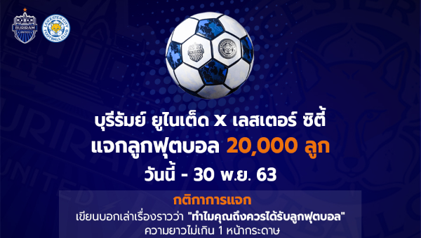 ล่าสุด สโมสรบุรีรัมย์ ยูไนเต็ด เดินหน้าเชิญชวนน้องๆ ทุกโรงเรียน หรือชุมชน ร่วมกิจกรรมแจกลูกฟุตบอล บุรีรัมย์ ยูไนเต็ด x เลสเตอร์ ซิตี้ เพียงร่วมเขียนบอกเล่าเรื่องราวว่า “ทำไมคุณถึงควรได้รับลูกฟุตบอล” ความยาวไม่เกิน 1 หน้ากระดาษA4 ด้วยลายมือ แล้วส่งจดหมายมาที่ ช้างอารีนา 444 หมู่ 15 ต.อิสาณ อ.เมืองบุรีรัมย์ จ.บุรีรัมย์ 31000 พร้อมรายละเอียด ชื่อ ที่อยู่ และเบอร์โทรศัพท์ที่ติดต่อได้ หมดเขต 30 พ.ย. 63 อย่าลืม!!! เขียนหน้าซองว่า "กิจกรรมแจกลูกฟุตบอล"