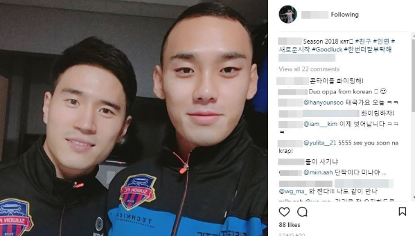 อู กึน-จอง โพสต์ภาพผ่านอินสตาแกรมส่วนตัว ในชุดสีเสื้อของ ซูวอน เอฟซี ทีมลีกรองเกาหลีใต้ พร้อมกับ มา ซาง-ฮุน