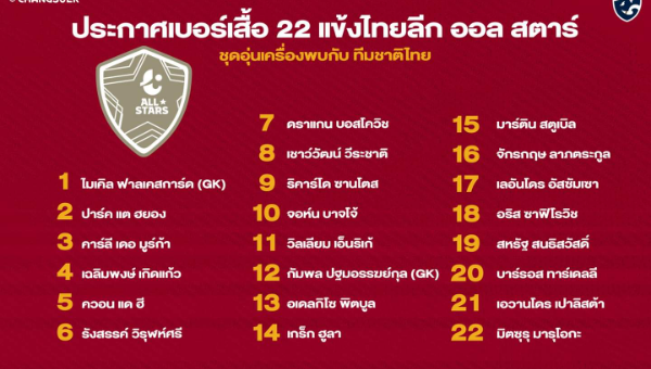 ประกาศเบอร์เสื้อ 22 แข้งไทยลีก ออล สตาร์ ชุดอุ่นเครื่องพบกับ ทีมชาติไทย ในวันที่ 14 พฤศจิกายน นี้