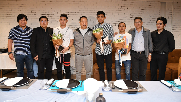 พล.ต.อ. สมยศ พุ่มพันธุ์ม่วง นายกสมาคมฯ พร้อมด้วย พล.ต.ท. พิสัณห์ จุลดิลก เลขาธิการฯ, นายพาทิศ ศุภะพงษ์ รองเลขาธิการฝ่ายต่างประเทศและโฆษกสมาคมฯ ได้เลี้ยงอาหารค่ำให้กับ 3 นักเตะทีมชาติไทย ที่จะเดินทางไปค้าแข้งที่ประเทศญี่ปุ่น ประกอบไปด้วย “มุ้ย” ธีรศิลป์ แดงดา กองหน้า, “อุ้ม” ธีราทร บุญมาทัน แบ็คซ้าย และ “เจ” ชนาธิป สรงกระสินธ์ ที่มาพร้อมกับ “เมย์” พิชญ์นาฏ สาขากร แฟนสาว, คุณวิลักษณ์ โหลทอง ประธานสโมสรเอสซีจี เมืองทอง ยูไนเต็ด และ คุณรณฤทธิ์ ซื่อวาจา ผู้อำนวยการสโมสรเอสซีจี เมืองทอง ยูไนเต็ด