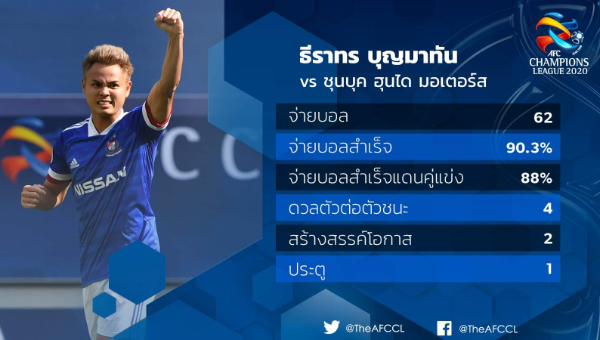 เผยสถิติ ธีราทร บุญมาทัน แบ็คซ้ายโยโกฮามา เอฟ มารินอส ในเกมช่วยทีมเอาชนะ ชุนบุค ฮุนได มอเตอร์ส 4-1 ในเอเอฟซี แชมเปี้ยนส์ลีก