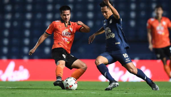 นาทีที่ 45+1 จักรพันธ์ แก้วพรม ยกบอลเข้ากรอบเขตโทษมี เควิน อินเกรโซ วิ่งเติมเกมทะลุช่องเข้าไปในกรอบเขตโทษ หวังจะไปให้ถึงบอล แต่ ศราวุธ อินทร์แป้น กองหลังทีมเยือน ขยับเข้ามาเตะสกัดไว้ก่อน ทว่าบอลปลิ้นวิถีไปตรงกรอบ สรานนท์ อนุอินทร์ ต้องออกแรงล้มตัวรับบอลไว้ได้