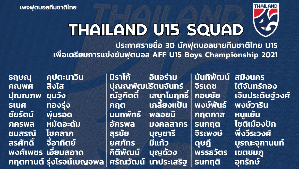 สมาคมกีฬาฟุตบอลแห่งประเทศไทย ในพระบรมราชูปถัมภ์ ทำการประกาศรายชื่อ 30 นักฟุตบอลชายทีมชาติไทย รุ่นอายุไม่เกิน 15 ปี เข้าเเคมป์เก็บตัวครั้งที่ 1 ระหว่างวันที่ 8-14 มีนาคม 2564 ณ ศูนย์พัฒนาศักยภาพกีฬา ภายในมหาวิทยาลัยกรุงเทพธนบุรี เพื่อเตรียมความพร้อมสำหรับการแข่งขันฟุตบอล AFF U15 Boys Championship 2021