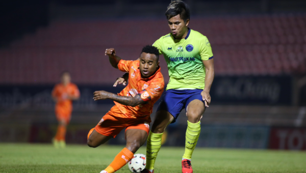 นาที 44 จุง เมียง โอ ได้ยิงในกรอบเขตโทษ ทว่าบอลไปตรงตัวปฏิวัติ คำไหม จบครึ่งเวลาแรก “เขี้ยวสมุทร” บุกนำ “ค้างคาวไฟ” 1-0