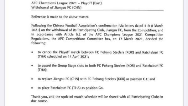 หลังจากที่ เจียงซู เอฟซี ทีมจากไชนีส ซูเปอร์ลีก ประกาศยุบทีมไป ทำให้มีกระแสข่าวว่า ราชบุรี มิตรผล ทีมจากไทยลีกและโปฮัง สตีลเลอร์ส จากเกาหลีใต้ที่ต้องเจอกันในรอบเพลย์ออฟ จะได้ส้มหล่นเข้าไปเล่นในรอบแบ่งกลุ่ม กลุ่มจี ทันที