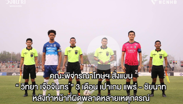 ซึ่งคณะพิจารณาวินัยมารยาทฯ มีบทลงโทษผู้ตัดสิน “วิทยา เจือจันทร์” ในการพักทำหน้าที่ตัดสินเป็นเวลา 3 เดือน หลังจากที่ผู้ตัดสินรายนี้ทำหน้าที่ได้อย่างผิดพลาดในเกมที่ห้วยม้า สเตเดี้ยม ระหว่าง แพร่ ยูไนเต็ด พบกับ ชัยนาท ฮอร์นบิล
