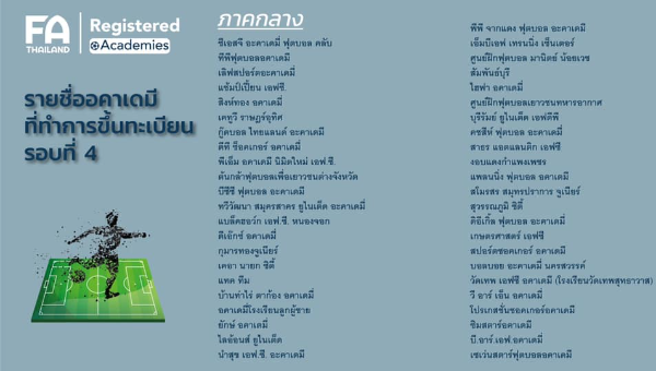 ในการนี้ สมาคมกีฬาฟุตบอลแห่งประเทศไทยฯ มีความยินดีอย่างยิ่งที่จะขอประกาศรายชื่อ ศูนย์ฝึกฟุตบอลเด็กและเยาวชน (อคาเดมี) รอบที่ 4 ที่ทำการขึ้นทะเบียน และมีเอกสารครบถ้วน ตามข้อกำหนดของสมาคมฯ ดังนี้