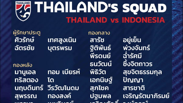 อากิระ นิชิโนะ หัวหน้าผู้ฝึกสอนทีมชาติไทย ประกาศรายชื่อ 23 ผู้เล่น ที่จะใช้ลงเล่นในศึกฟุตบอลโลก 2022 รอบคัดเลือก โซนเอเชีย รอบสอง กลุ่ม G นัดที่ 6 พบกับ ทีมชาติอินโดนีเซีย ออกมาเป็นที่เรียบร้อย
