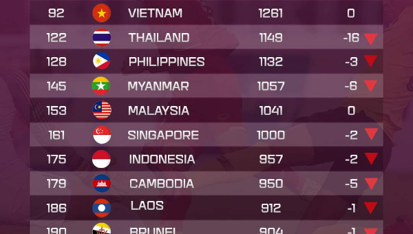 โดยในระดับอาเซียน เวียดนาม ยังคงยืน 1 รั้งอันดับ 92 ของโลก ส่วนอันดับ 3 ของอาเซียน เป็น ฟิลิปปินส์ รั้งอันดับ 129