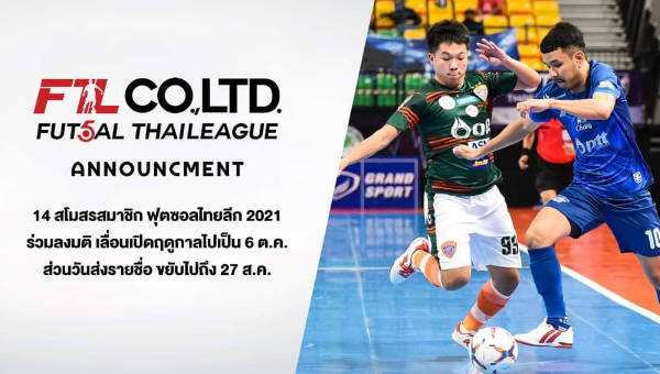 14 สโมสรสมาชิกฟุตซอลไทยลีก2021 ร่วมลงมติ เลื่อนเปิดฤดูกาลไปเป็น 6 ต.ค. หลังจบฟุตซอลโลก ด้วยสถานการณ์โควิด และ เพื่อให้ทีมฟุตซอลทีมชาติไทยได้เตรียมทีมอย่างเต็มที่ ส่วนวันส่งรายชื่อขยับไปถึง 27 ส.ค.