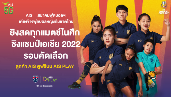 AIS ขอร่วมเป็นส่วนหนึ่งในเส้นทางการเปิดโลกบอลไทยไปกับ AIS PLAY รับชม ศึกฟุตบอลหญิงชิงแชมป์เอเชีย 2022 รอบคัดเลือก ที่เดียวบน AIS PLAY เท่านั้น พิเศษสำหรับแฟนบอลชาวไทยร่วมรับชมฟุตบอลไทยลีก T1-3, ช้างเอฟเอ คัพ, รีโว่ ลีก คัพ, ฟุตบอลทีมชาติไทยชาย หญิง และฟุตซอลทีมชาติไทย ได้ฟรี ไม่มีค่าใช้จ่าย ไม่ต้องสมัครแพ็กเกจเพิ่มเติม
