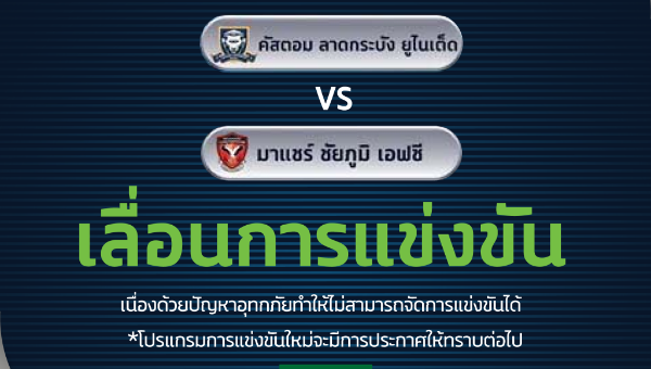 ไทยลีก ขอประกาศเลื่อนการแข่งขันฟุตบอลช้าง เอฟเอ ค้พ 2021/22 รอบคัดเลือก คู่ระหว่าง มาแชร์ ชัยภูมิ เอฟซี พบ คัสตอม ลาดกระบัง ยูไนเต็ด