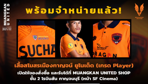 เสื้อแข่งเหย้า เมืองกาญจน์ ยูไนเต็ด ฤดูกาลใหม่ เกรด Player ล่าสุด พร้อมให้แฟนบอลจับจองเป็นเจ้าของแล้ว โดยเสื้อแข่งชุดเหย้า สโมสรฯของเรา แฟนๆ สามารถเริ่มเปิดให้จองสั่งซื้อตั้งแต่วันที่ 1 ตุลาคม 2564 เป็นต้นไปที่ MUANGKAN UNITED SHOP ชั้น 2 โรบินสัน กาญจนบุรี (หน้า SF CINEMA) ในเวลา 11.00 -19.00 น. ราคาเพียง 789 บาทเท่านั้น  มีจำนวนจำกัด หรือโทรสอบถามเพิ่มเติมได้ที่เบอร์ 097-123-4292