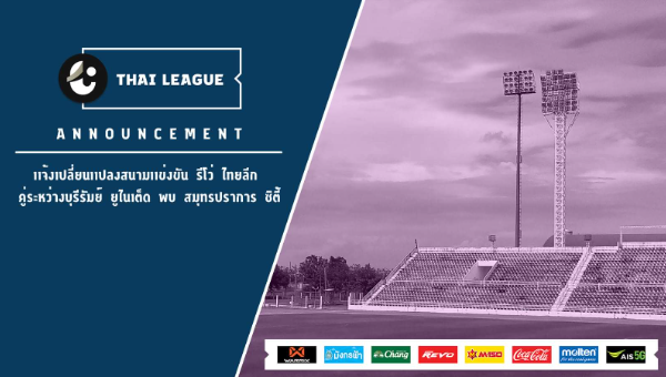 ประกาศ : แจ้งเปลี่ยนแปลงสนามแข่งขัน รีโว่ ไทยลีก คู่ระหว่าง บุรีรัมย์ ยูไนเต็ด พบ สมุทรปราการ ซิตี้