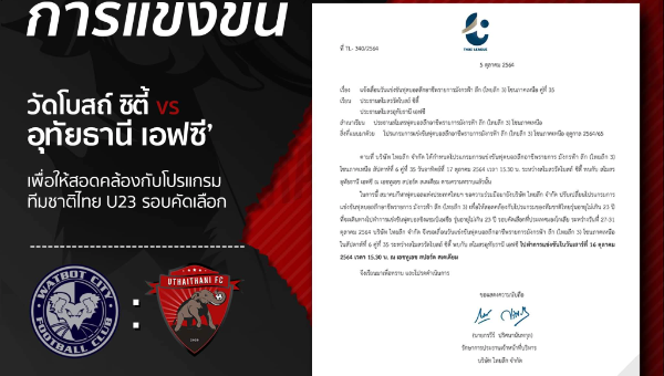 แจ้งเปลี่ยนแปลงโปรแกรมการแข่งขัน มังกรฟ้า ลีก โซนภาคเหนือระหว่างสโมสร วัดโบสถ์ ซิตี้ พบกับ สโมสรอุทัยธานี เอฟซี ไปทำการแข่งขันในวันเสาร์ที่ 16 ตุลาคม 2564 เวลา 15.30 น.ที่สนาม เอชทูเอช สปอร์ต สเตเดียม เพื่อให้สอดคล้องกับโปรแกรมของทีมชาติไทยรุ่นอายุไม่เกิน 23 ปี  ที่จะเดินทางไปทำการแข่งขันฟุตบอลชิงแชมป์เอเชีย รุ่นอายุไม่เกิน 23 ปี รอบคัดเลือกที่ประเทศมองโกเลีย ระหว่างวันที่ 27-31 ตุลาคม 2564 จึงเรียนมาเพื่อทราบ