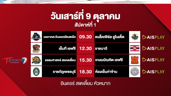 คู่แรก เวลา 09.30น.  มอภาคตะวันออกเฉียงเหนือ พบ แบล็คเพิร์ล ยูไนเต็ด ถ่ายทอดสดทาง แอพพลิเคชั่น AIS PLAY