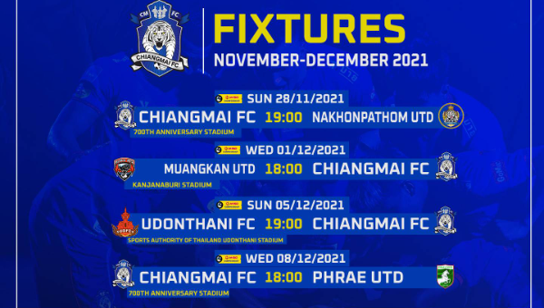 อัปเดตโปรแกรม และสนามแข่งขัน "พยัคฆ์ล้านนา" หลังบริษัท ไทยลีก จำกัด ประกาศกำหนดการแข่งขันนัดตกค้างของสโมสรเชียงใหม่ เอฟซี ที่ถูกเลื่อนจากกำหนดเดิม 2 นัด รวมถึงเรื่องการเปลี่ยนสนามเหย้าเป็นการชั่วคราว⁣มาใช้สนามกีฬาสมโภชเชียงใหม่ 700 ปี ในวันที่ 28 พ.ย.64 และ 8 ธ.ค.64 พร้อมเปิดเข้าชม 25% พิเศษ! ตั๋วปี CMFC แลกบัตรหน้างานเข้าชมฟรี และมีจำหน่ายบัตรเข้าชมหน้าสนาม