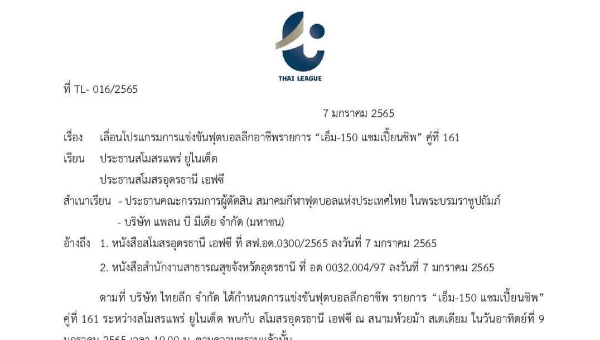 ฝ่ายจัดการแข่งขันฯ จึงขอแจ้งเลื่อนโปรแกรมการแข่งขันฟุตบอลลีกรายการ "เอ็ม-150 แชมเปี้ยน