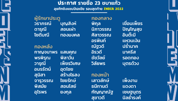สมาคมกีฬาฟุตบอลแห่งประเทศไทย ในพระบรมราชูปถัมภ์ ประกาศรายชื่อ 23 นักฟุตบอลหญิงทีมชาติไทย ชุดใหญ่ เพื่อเข้าร่วมการแข่งขันฟุตบอลหญิงชิงแชมป์เอเชีย 2022 รอบสุดท้าย ที่ประเทศอินเดีย ระหว่างวันที่ 20 มกราคม – 6 กุมภาพันธ์ 2565 “2022 AFC Women's Asian Cup”