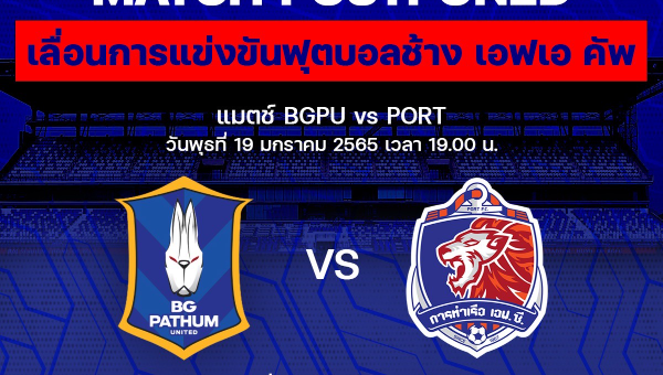 บริษัท ไทยลีก จำกัด ประกาศเลื่อนการแข่งขันฟุตบอลช้าง เอฟเอ คัพ 2021-22 รอบ 16 ทีมสุดท้าย ระหว่าง บีจี ปทุม ยูไนเต็ด เปิดบ้านพบ การท่าเรือ เอฟซี ที่สนามบีจี สเตเดี้ยม ในวันพุธที่ 19 มกราคม 2565 เวลา 19.00 น.