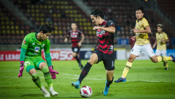 นาทีที่ 89 รุ่งรัฐ เลี้ยงจากทางขวาก่อนหักเข้าในแล้วลองซัดด้วยซ้าย บอลพุ่งแรงแต่ยังเหินข้ามคานออกไป