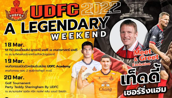 สโมสรฟุตบอลอุดรธานี เชิญชวนทุกท่านร่วมงาน "UDFC A Legendary Weekend" สุดสัปดาห์ในตำนาน กับ UDFC ในวันที่ 18 – 20 มีนาคม 2565 พร้อมแขกรับเชิญพิเศษ Teddy Sheringham นักฟุตบอลชื่อดังระดับโลก เจ้าของฉายา "ดาวซัลโวพรีเมียร์ลีก"