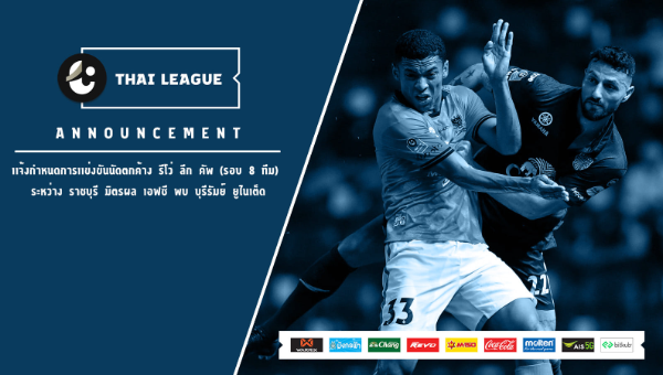 ฝ่ายจัดการแข่งขันไทยลีก จึงขอแจ้งกำหนดการแข่งขันใหม่ ของฟุตบอลรายการ รีโว่ ลีก คัพ รอบ 8 ทีมสุดท้าย คู่ระหว่าง ราชบุรี มิตรผล เอฟซี พบ บุรีรัมย์ ยูไนเต็ด