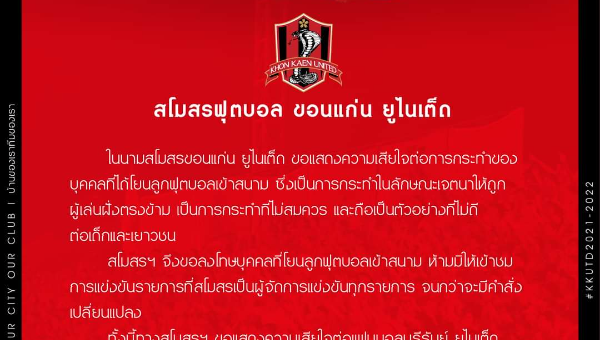 ในนามสโมสรขอนแก่น ยูไนเต็ด ขอแสดงความเสียใจต่อการกระทำของ บุคคลที่ได้โยนลูกฟุตบอลเข้าสนาม ซึ่งเป็นการกระทำในลักษณะเจตนาให้ถูก ผู้เล่นฝั่งตรงข้าม เป็นการกระทำที่ไม่สมควร และถือเป็นตัวอย่างที่ไม่ดี ต่อเด็กและเยาวชน