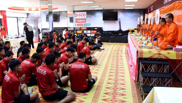 ขณะที่บรรยากาศเป็นไปอย่างเรียบง่าย มีการนิมนต์พระสงฆ์จำนวน 9 รูป จากวัดสระเกศราชวรมหาวิหาร มาร่วมเจริญพระพุทธมนต์ ก่อนจะถวายภัตตาหารเพล และปิดท้ายด้วยการพรมน้ำมนต์ให้กับทางผู้บริหาร, นักเตะ รวมไปถึงเจ้าหน้าที่สโมสรฯ เพื่อความเป็นสิริมงคล สำหรับเตรียมความพร้อมไล่ล่าความสำเร็จศึกฟุตบอล 3 รายการใหญ่ทั้ง โตโยต้า ไทยลีก, โตโยต้า ลีกคัพ และเอฟ เอคัพ