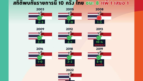 สถิติการพบกันในรายการนี้ 10 ครั้ง ไทย ชนะ 8 แพ้ 1 เสมอ 1
