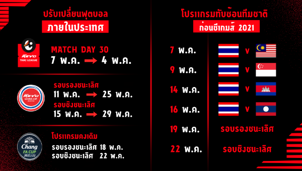 จากเดิมนัดสุดท้ายประจำฤดูกาล2021/22 วันที่ 7 พฤษภาคม 2565 เปลี่ยนเป็นวันที่ 4 พฤษภาคม 2565